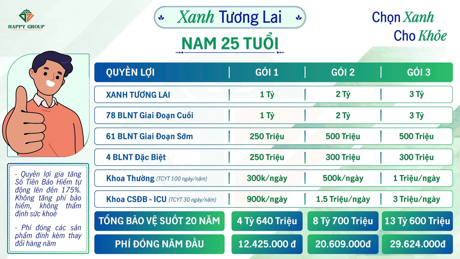 Gói bảo hiểm Xanh Tương Lai dành cho Nam 25 tuổi giúp bạn: